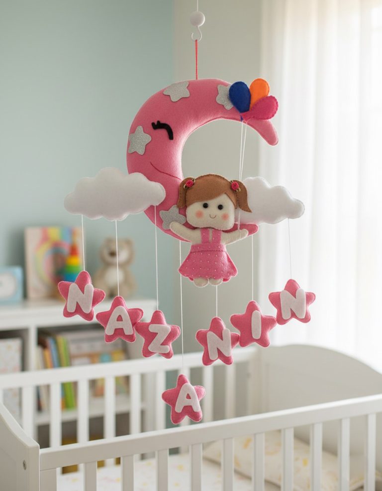این آویز اسم دخترانه از جنس نمد با طراحی ظریف و رنگبندی شاد، یک انتخاب فوقالعاده برای تزیین اتاق کودک و کمد شماست.