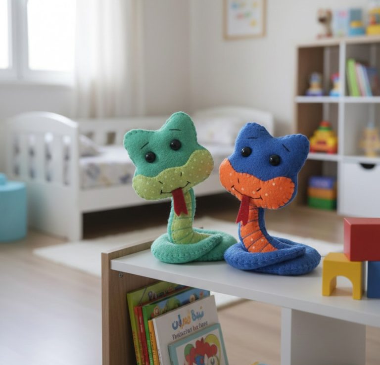 عروسک مار دوعددی نمدی یک ست فانتزی و جذاب است که با طراحی بامزه، دوخت تمیز و رنگهای شاد، فضای اتاق کودک را زیباتر و سرگرمکنندهتر میکند.